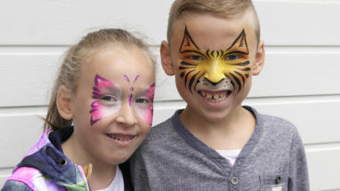 Fantasievolle Bemalungen mit herrlichen Glitzereffekten entstehen in kürzester Zeit vor den Augen Ihrer Kunden und Besucher. Die Verwandlung mit Farbe, Pinsel und Glitzer fasziniert jeden und macht Ihre Veranstaltung zu einem unvergesslichen Ereignis.Kinderschminken ist beliebter denn je, und auf allen möglichen Veranstal- tungen zu finden. Gern sieht man auf den Events die bunt geschminkten, fantasievollen Schminkgesichter und Kinder mit strahlenden Augen. Im Durchschnitt finden Kinder und Jugendliche von 3 bis 12 Jahren Kinderschminken interessant. Je nach Aufwand benötige ich etwa 5-9 Minuten für eine Maske, um die Kinder zu verschönern. Bei älteren Kindern empfehle ich Glitzer- oder Metallictattoos.